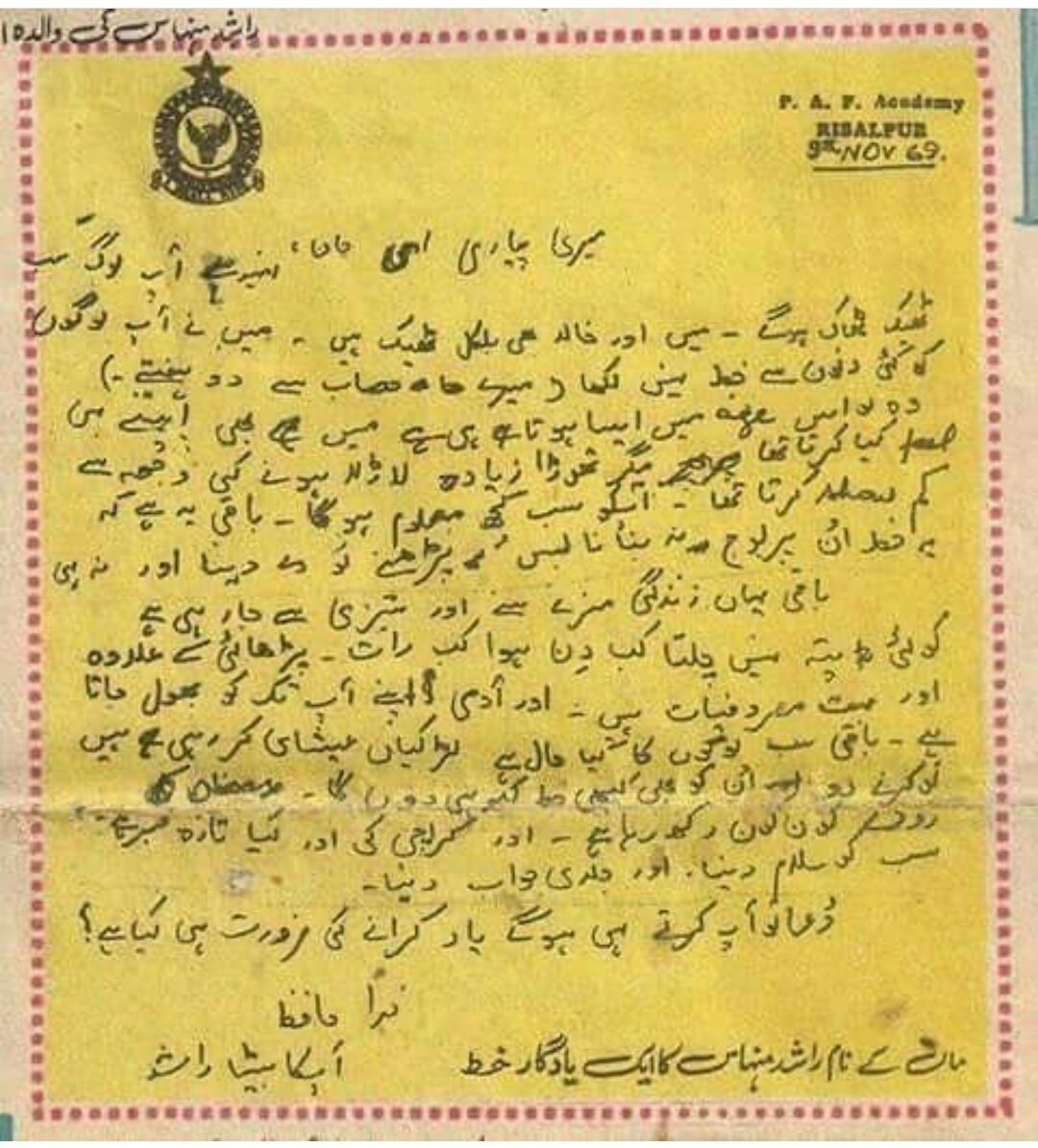 ایسا ہی ایک خط فلائیٹ لیفٹیننٹ راشد منہاس نے اپنی والدہ رشیدہ منہاس کو 9 نومبر 1969 کو لکھا تھا خط پر تاریخ بھی درج ہے