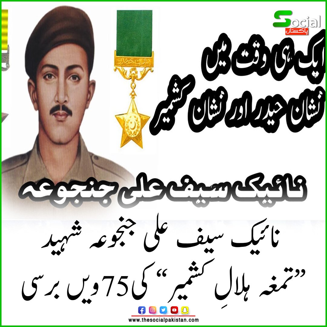 نائیک سیف علی جنجوعہ شہید( نشان حیدر )کا 75واں یوم شہادت آج عقیدت و احترام سے منایا جارہا ہےنائیک سیف علی جنجوعہ شہید “تمغہ ہلالِ کشمیر” کی آج 75ویں برسی منائی جارہی ہے ، انہیں 1948 میں بہادری کی اعلیٰ مثال قائم کرنے پرآزاد جموں و کشمیر حکومت نے “ہلال کشمیر” کے اعزاز سے نوازا گیا جو نشان حیدر کے مساوی ہے۔۔افواج پاکستان، چیئرمین جوائنٹ چیفس آف سٹاف کمیٹی اور سروسز چیفس نے انہیں خراج عقیدت پیش کیا ہے۔
